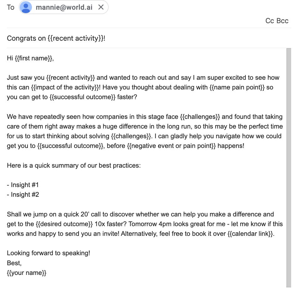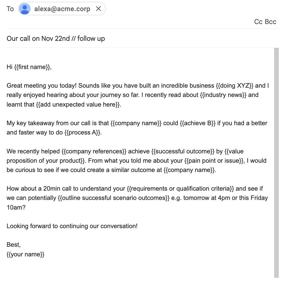 Luckily, writing good follow ups and getting replies is an activity with super fast feedback loops: you either get the next step, a “no, thank you” or simply get ignored. Running A/B tests and adjusting your writing style based on what works is what makes a huge difference in the long run.