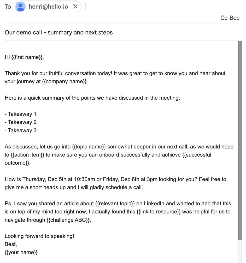 Think of the person looking to solve a specific problem: you do not want to be the process of buying from you get more complex than the actual problem they are trying to solve. Moving the needle does not have to be hard or require huge commitment from your prospects: instead of asking for their availability for a demo session, propose two slots that fit you and ask them to simply choose “1” or “2” and promise to get back with an invite. Instead of proposing a 1h PoC planning session, send a proposal of what PoC plan could look like and say that you can review it in a 15min call in case they have any objections. Make it easy to simply say yes. Eliminate any non-essential tasks and make it not only easy, but desirable to work with you.